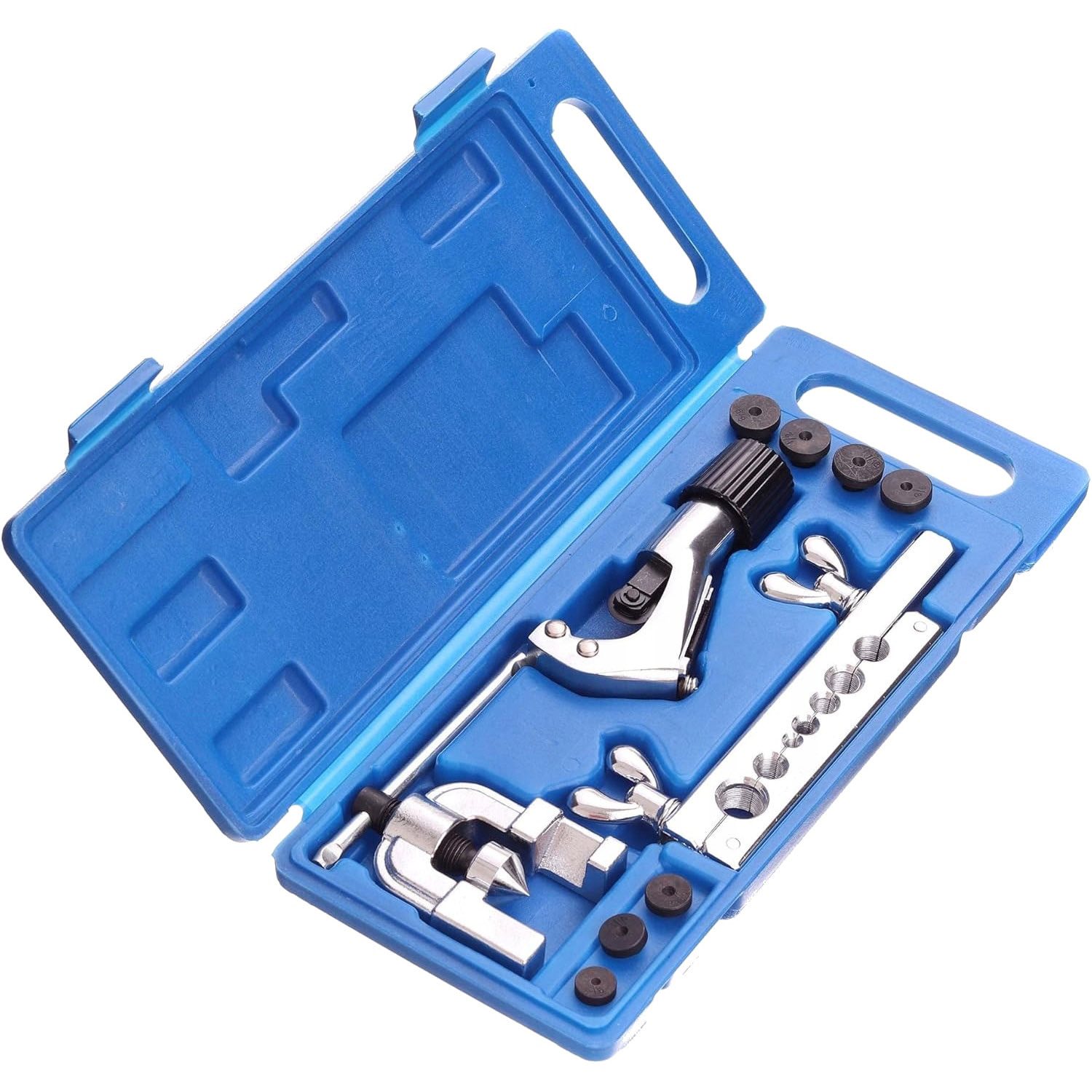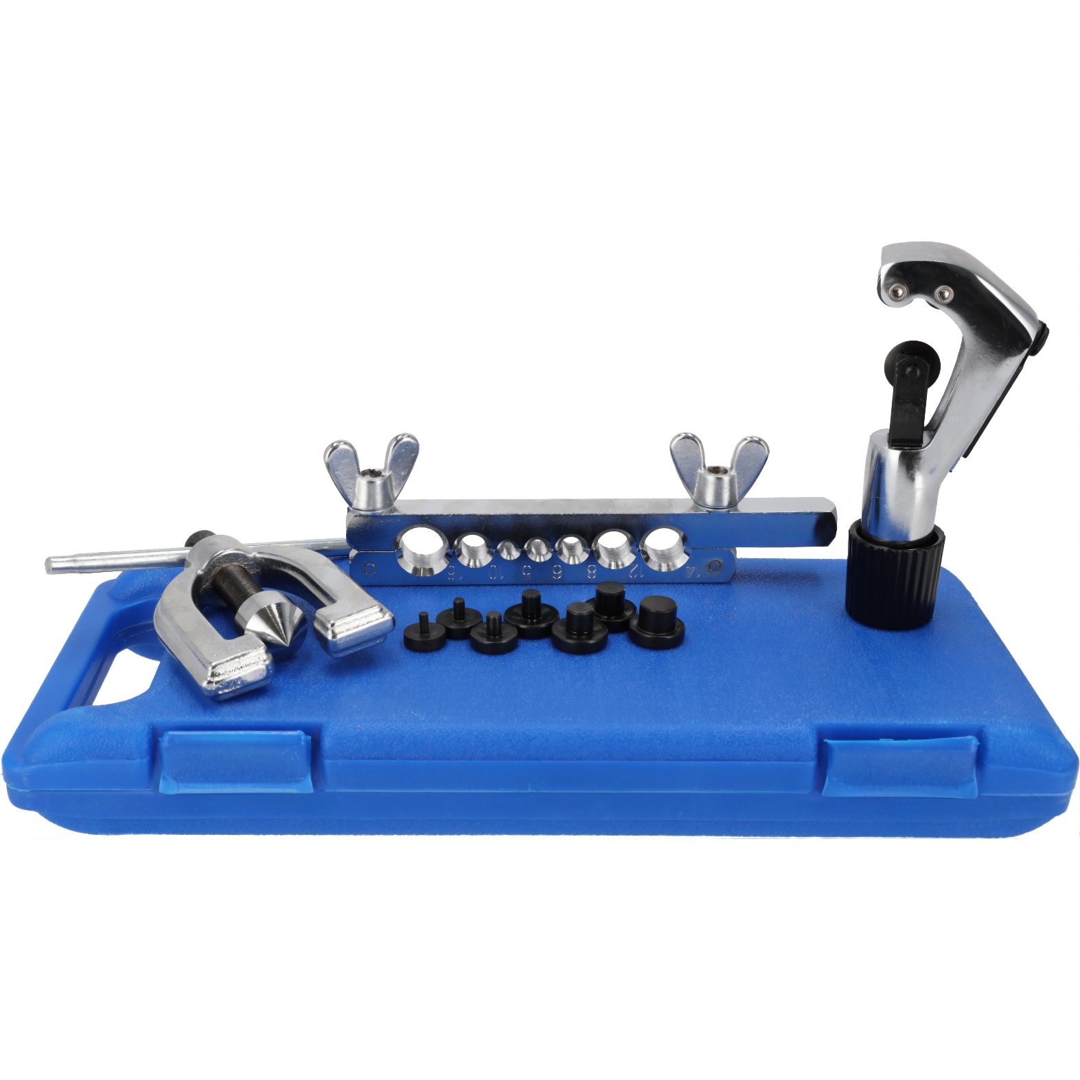 - Комплектът включва различни адаптери, съвместими с най-често използваните размери тръби, както и резачка за чисто и точно отрязване.